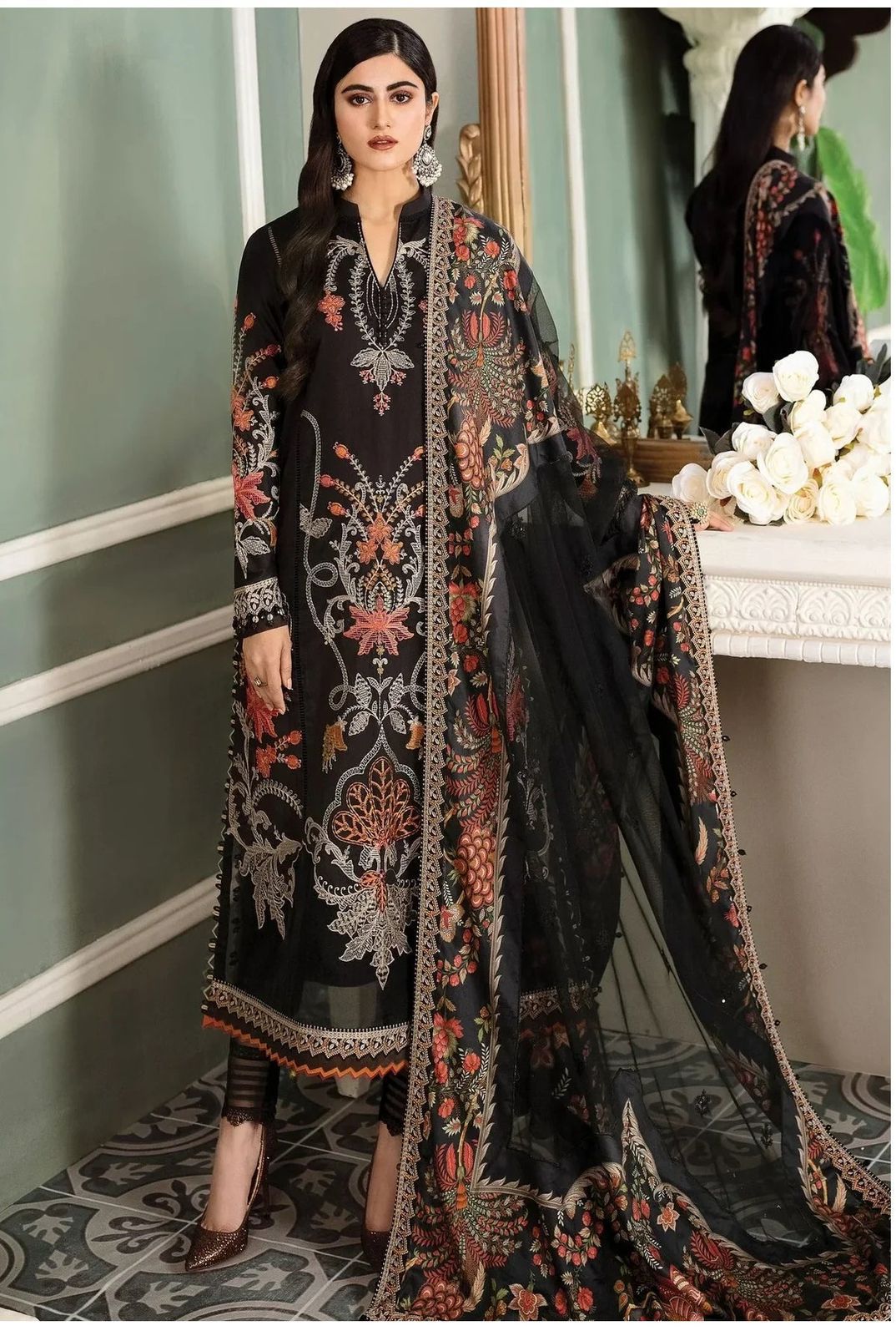 lawn fully heavy embroidered spengle work centre panel with heavy embroidered spengle left & right panel with scifflie embroidered lace for left and right panel attach with heavy embroidered spengle work daman boarder